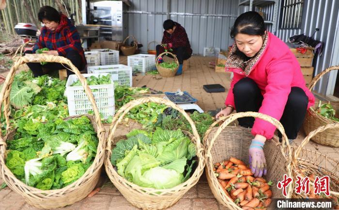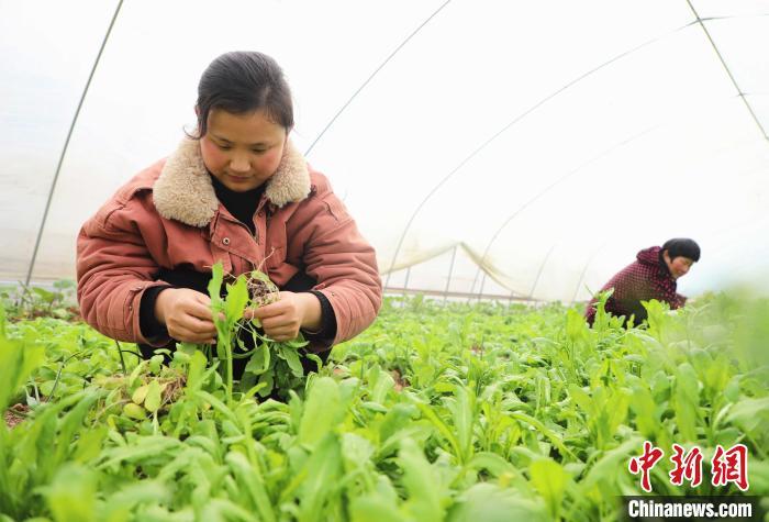 2月14日,安徽省肥西縣紫蓬山旅游開發(fā)區(qū)張老圩村風之谷家庭農(nóng)場內(nèi),農(nóng)民在給菜地澆水,采摘、分揀新鮮蔬菜供應市場,田間地頭一派繁忙景象。