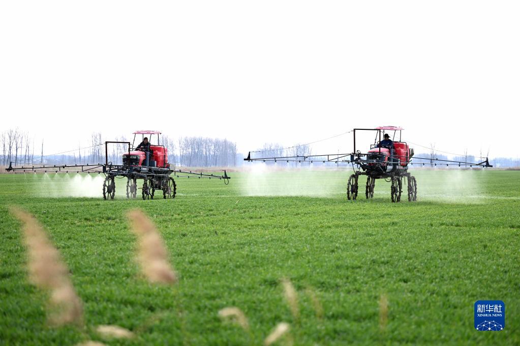 2月14日,在安徽省蚌埠市五河縣頭鋪鎮(zhèn),農(nóng)民駕駛農(nóng)機(jī)給小麥噴灑農(nóng)藥。記者 黃博涵 攝