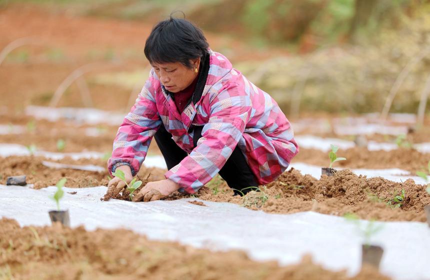 2月28日,江西省宜春市上高縣墨山鄉(xiāng)香山村蔬菜種植基地,菜農正在種植蔬菜。近年來,在政策扶持和農業(yè)技術支持下,該村大力發(fā)展黃土地蔬菜種植,黃瓜、苦瓜、豆角、茄子等綠色蔬菜銷往全國多地,讓當?shù)夭宿r在家門口就業(yè)增收。