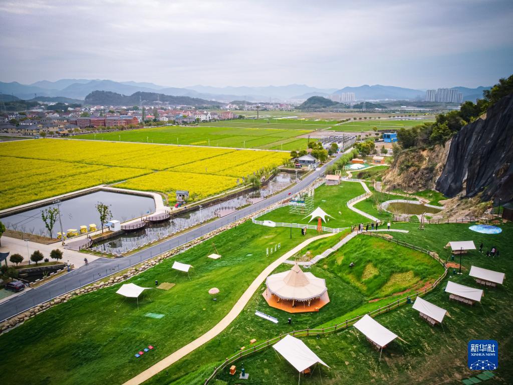 這是3月29日拍攝的諸暨市楓橋鎮(zhèn)杜黃新村用廢棄礦山改造的露營(yíng)旅游地(無(wú)人機(jī)照片)。記者 江漢 攝