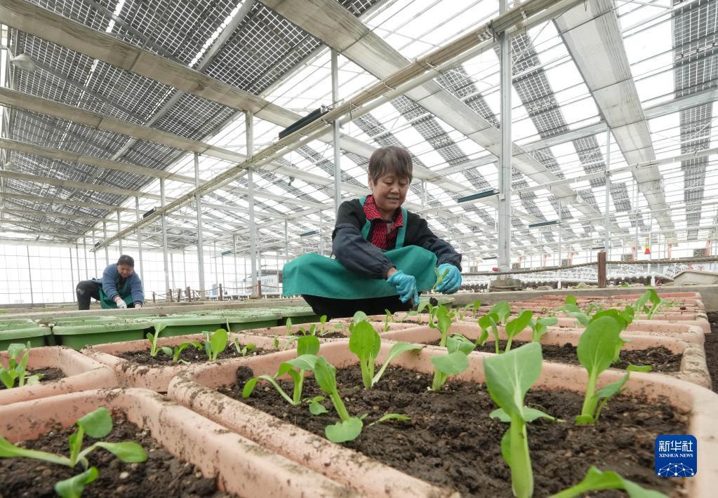4月3日,工人在秦皇島市撫寧區(qū)墳坨鎮(zhèn)一處智能光伏溫室內(nèi)栽植盆景白菜。記者 楊世堯 攝
