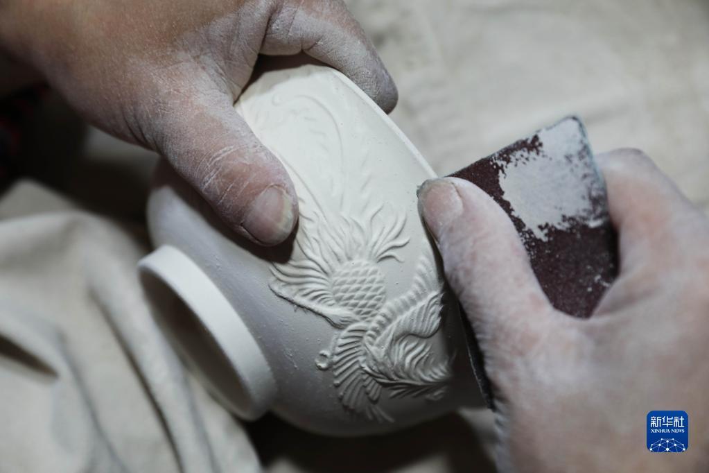 4月19日,在寶豐縣一家汝瓷企業(yè)生產(chǎn)車間,汝瓷藝人在打磨素坯。何五昌 攝