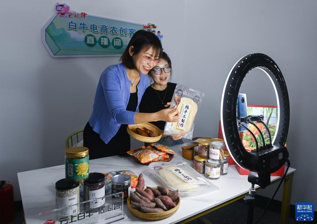 4月20日,在昌化鎮(zhèn)白牛村直播間,青年創(chuàng)客張青(左)和助手一起推介特色農(nóng)產(chǎn)品。記者 徐昱 攝