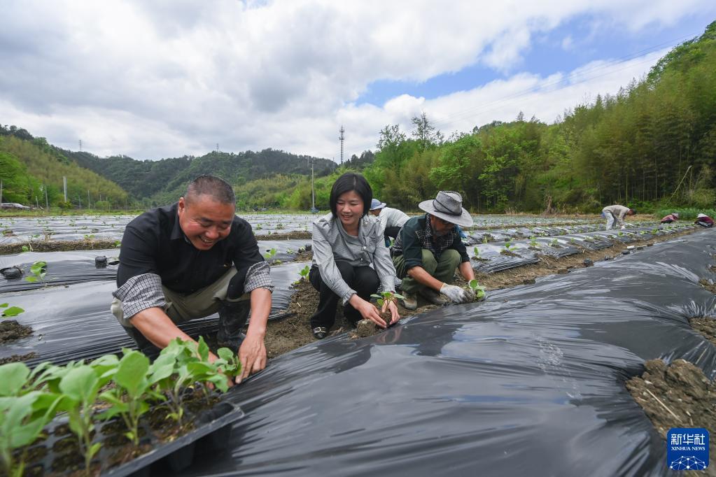 4月20日,返鄉(xiāng)創(chuàng)業(yè)人才俞冬紅(中)在位于臨安區(qū)昌化鎮(zhèn)后營(yíng)村的蔬菜基地與農(nóng)戶交流。記者 徐昱 攝