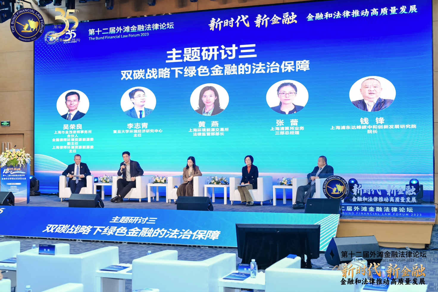 “雙碳戰(zhàn)略下綠色金融的法治保障”主題研討環(huán)節(jié),由上海市金茂律師事務(wù)所合伙人吳榮良律師主持,來自復(fù)旦大學(xué)綠色金融研究中心的李志青教授、上海環(huán)境能源交易所法律監(jiān)管部黃燕部長(zhǎng)、上海清算所業(yè)務(wù)三部張蕾總經(jīng)理、上海浦東達(dá)峰碳中和創(chuàng)新發(fā)展研究院錢鋒院長(zhǎng)共同參與研討。