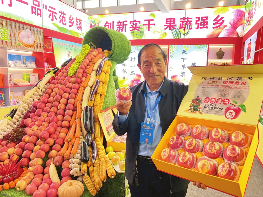 社長王萬保在展示合作社文化藝術(shù)蘋果 張新征 攝