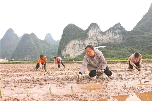 在平樂(lè)縣沙子鎮(zhèn)治平村萬(wàn)畝淮山、葛根種植基地里,村民們正在查看滴灌的保濕度,管護(hù)新栽種的淮山苗。