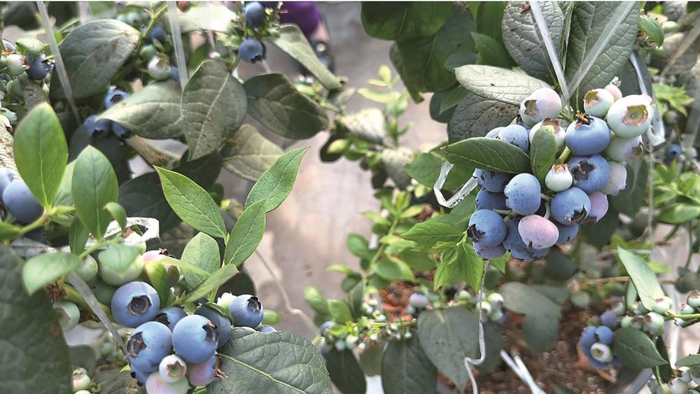 走進(jìn)藍(lán)莓大棚,記者看到成片的藍(lán)莓樹長勢蔥郁,一顆顆飽滿圓潤、色澤鮮亮的藍(lán)莓果呈藍(lán)紫色,被一層薄薄的糖霜包裹著,在陽光和綠葉的映襯下更顯誘人可愛。
