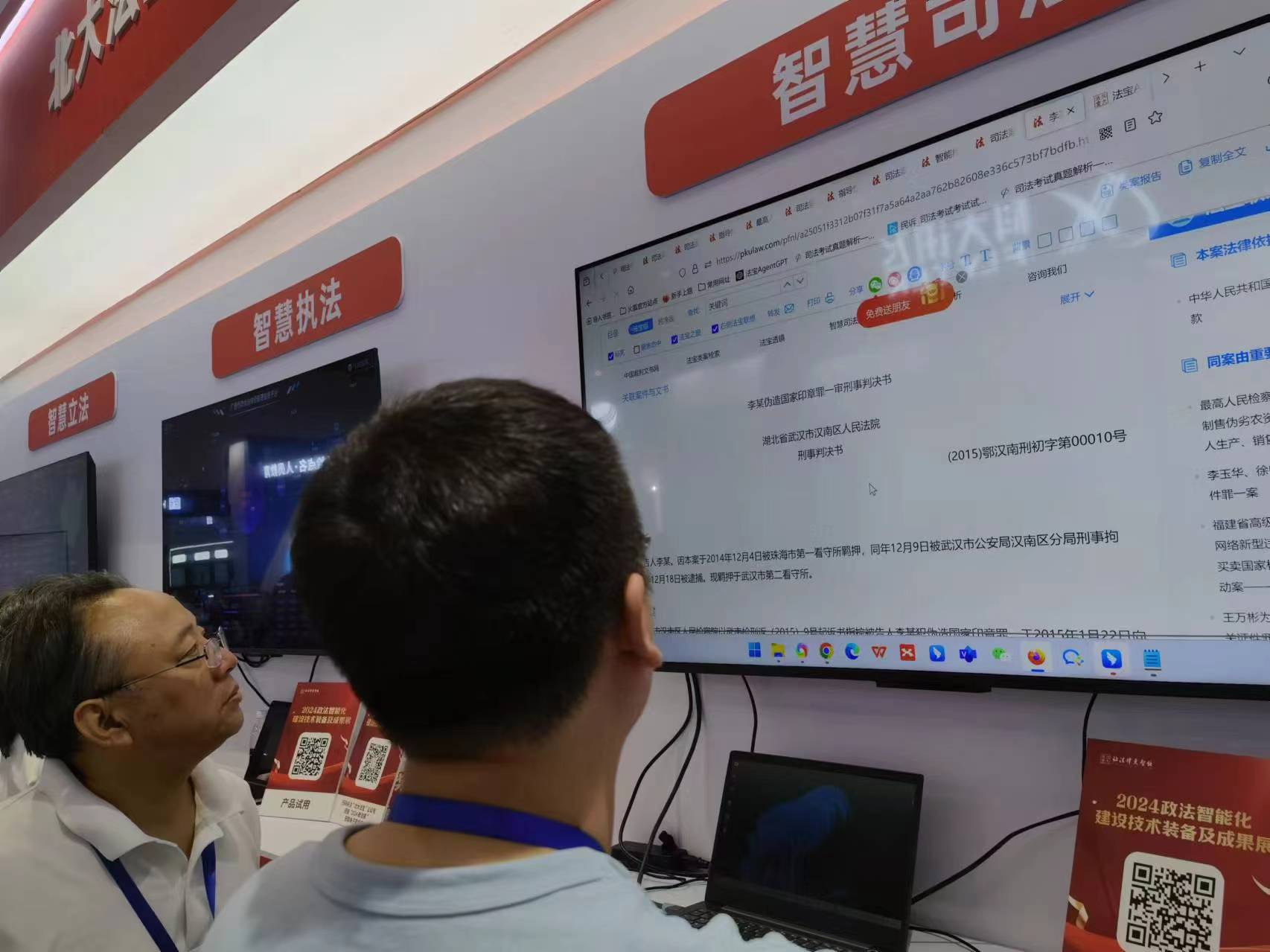 7月10日,記者在北京國(guó)家會(huì)議中心參觀由法制日?qǐng)?bào)社主辦的“2024政法智能化建設(shè)技術(shù)裝備及成果展”(以下簡(jiǎn)稱“政法裝備展”)時(shí),看到了法律大模型給司法工作帶來(lái)高效便捷新賦能的各類演示場(chǎng)景。