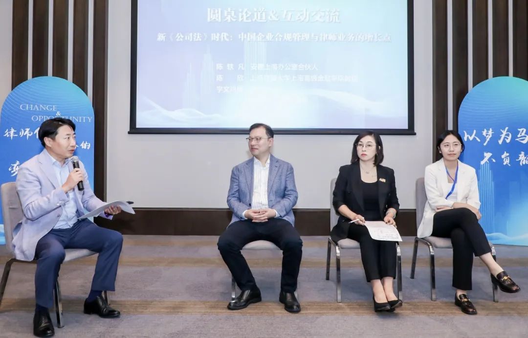 新《公司法》的實施為企業(yè)合規(guī)管理設置了很多新的課題,亦為律師展業(yè)提供了許多新的機會。為此,青年律師該如何“借勢”,化挑戰(zhàn)為機遇,實現(xiàn)個人成長?圍繞此話題,陳欣教授、安理合伙人宇文鴻雁律師、青年律師代表劉豆律師給出了諸多有益建議。陳軼凡律師擔任本環(huán)節(jié)主持。