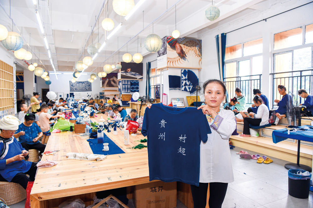2023年5月貴州村超開賽后,現(xiàn)場數(shù)萬群眾踴躍參與的熱情、場內(nèi)外豐富瑰麗的非遺展演,讓這項村級賽事迅速在全網(wǎng)發(fā)酵。村超爆紅,讓貴州多彩民族文化“被看見”,更帶動了當?shù)靥厣椀仁止に嚻贰俺鋈Α?,榕江村寨里以往賦閑在家、照看孫輩的嬢嬢們,因此有了在家門口、江水邊、榕樹下發(fā)揮特長就業(yè)創(chuàng)收的機會。