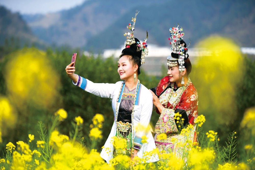 盛裝打扮的侗族姑娘在榕江縣樂鄉(xiāng)侗寨油菜花田間自拍