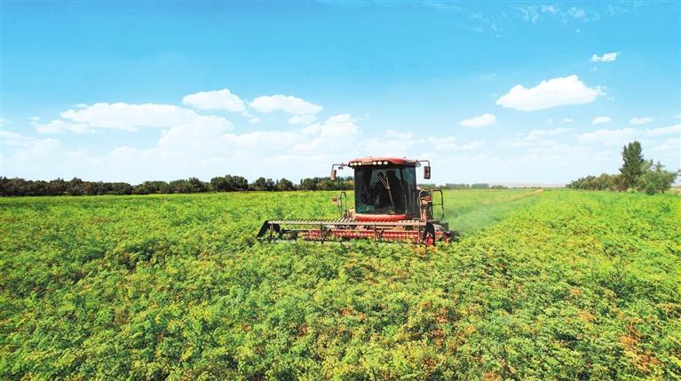 但見地里的苜蓿有高有低、呈波浪狀?!澳闱疲覀冝r(nóng)場(chǎng)進(jìn)行植株高低搭配,將個(gè)頭較高的WJ363HK苜蓿與個(gè)頭低的阿蒂娜間作套種,當(dāng)苜蓿大面積開花時(shí),能充分享受陽(yáng)光,提高苜蓿牧草的粗蛋白含量?!壁w富強(qiáng)說(shuō)著算了一筆賬:今年6月10日到20日,頭茬苜蓿成熟,19臺(tái)大型機(jī)械搶趕時(shí)間,一個(gè)多星期就收割結(jié)束,保障了粗蛋白含量高達(dá)20%以上;目前第二茬苜蓿只有40厘米高,長(zhǎng)到7月下旬80厘米左右即可收割;第三茬苜蓿到9月中下旬時(shí)收割。1畝苜蓿收割3茬、可產(chǎn)900公斤至1噸干草,按照目前市場(chǎng)價(jià)1噸干草1600至1800元計(jì)算,收益可觀。