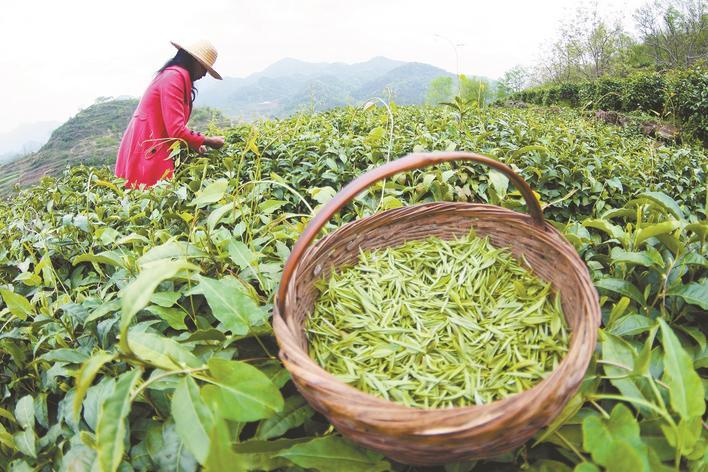 鄖陽區(qū)譚家灣鎮(zhèn)五道嶺村茶農(nóng)在茶園采摘茶葉