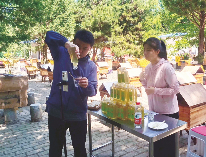 普社村第一場直播開始時,大山深處的大片洋槐花已開到了尾聲。景嘉麗和“90后”鎮(zhèn)紀檢干部劉勇一起站在鏡頭前,小蜜蜂在旁邊“嗡嗡嗡”地飛來飛去,鎮(zhèn)上干部圍站在鏡頭背后,很多村民也趕來看熱鬧。隨著直播間涌進來的網(wǎng)友越來越多,提問也越來越多,兩人逐漸放松:“家人們,我們背后的山上全是洋槐樹,這里沒有污染,洋槐花蜜的品質特別好。”首場直播,兩個小時賣出了300余單蜂蜜,價值2萬多元。對于一個地處大山深處的小鄉(xiāng)村而言,這個成績讓所有人喜出望外,也堅定了高崖鎮(zhèn)繼續(xù)通過網(wǎng)絡直播幫助群眾銷售農(nóng)產(chǎn)品的信心,如今助農(nóng)直播成為該鎮(zhèn)常態(tài)化工作之一。