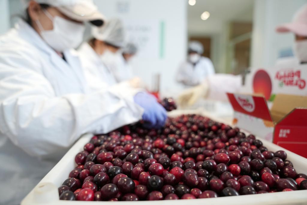 1月29日,在黑龍江省撫遠市蔓越莓種植基地,工作人員分揀蔓越莓鮮果 記者 王建威 攝