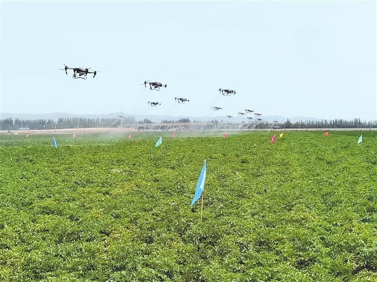 永昌縣聯(lián)聯(lián)眾力農機農民專業(yè)合作社正在進行無人機飛防作業(yè) 記者 馬國順