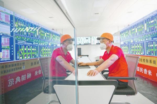 湖南生平米業(yè)股份有限公司的工作人員通過遠程智能化自動生產(chǎn)大米 記者 郭立亮 攝