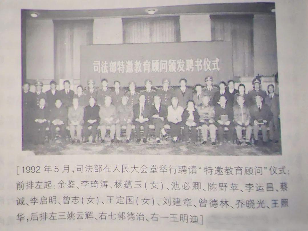 1992年5月,司法部會同中國關(guān)心下一代工作委員會,聯(lián)合聘請陳野蘋、曾志、王照華、池必清、喬曉光、李啟明、李運(yùn)昌、劉建章、何光、曾德林、楊蘊(yùn)玉、張文松、李琦濤、王定國等十四位老同志擔(dān)任“司法部特邀教育顧問”,并在人民大會堂舉行了隆重的頒發(fā)聘書儀式。在這批德高望重的革命前輩的熱情參與下,監(jiān)獄管理機(jī)關(guān)的教育改造質(zhì)量和社會影響力有了新的提升。由于工作原因,我有幸親歷和見證了他們到監(jiān)獄開展幫教活動的一幕幕感人至深的場景。