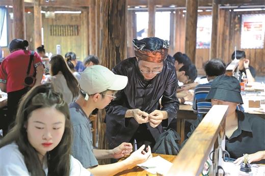 當(dāng)下,“非遺+旅游”成了苗寨文旅融合發(fā)展的新熱點(diǎn)。當(dāng)?shù)匾劳蟹沁z資源優(yōu)勢,圍繞蠟染、刺繡、銀飾等非遺文化,推出非遺研學(xué)體驗(yàn)文旅項(xiàng)目,吸引了大批游客前來。