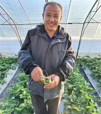 “我們采用了冷凍苗種植技術,主要是為了促進花芽分化,拉開晝夜溫差,讓所有的營養(yǎng)聚集在根系。冷凍苗種植技術還有一個好處,就是在冷凍的過程當中,草莓苗里所有的細菌都已經(jīng)被凍死了,種植到大棚里之后長得健碩,基本上不使用農(nóng)藥,純綠色種植?!闭诖笈锢锸峁内w海秋說。