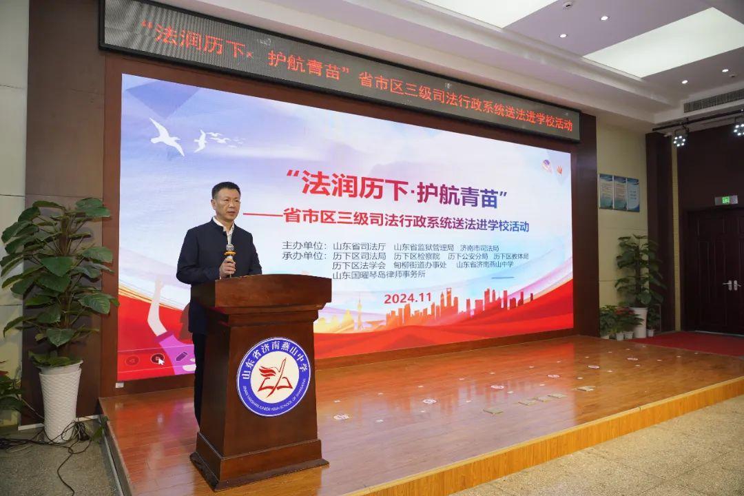 為貫徹落實(shí)山東省未成年人違法犯罪綜合治理工作座談會(huì)精神,切實(shí)發(fā)揮普法工作在未成年違法犯罪中的源頭預(yù)防作用,11月11日,省市區(qū)三級(jí)司法行政系統(tǒng)組織開展的“法潤(rùn)歷下·護(hù)航青苗”送法進(jìn)學(xué)校活動(dòng)在燕山中學(xué)正式啟動(dòng)。山東省司法廳黨委委員、副廳長(zhǎng),省監(jiān)獄局黨委書記、局長(zhǎng)王發(fā)軍出席活動(dòng)。