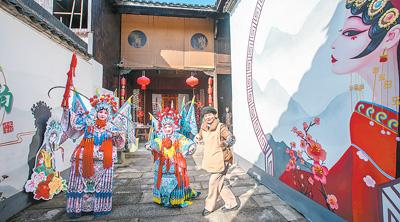 在浙江省金華市鄭店村婺劇非遺主題館,村劇團老師給游客指導婺劇基本動作。楊梅清 攝