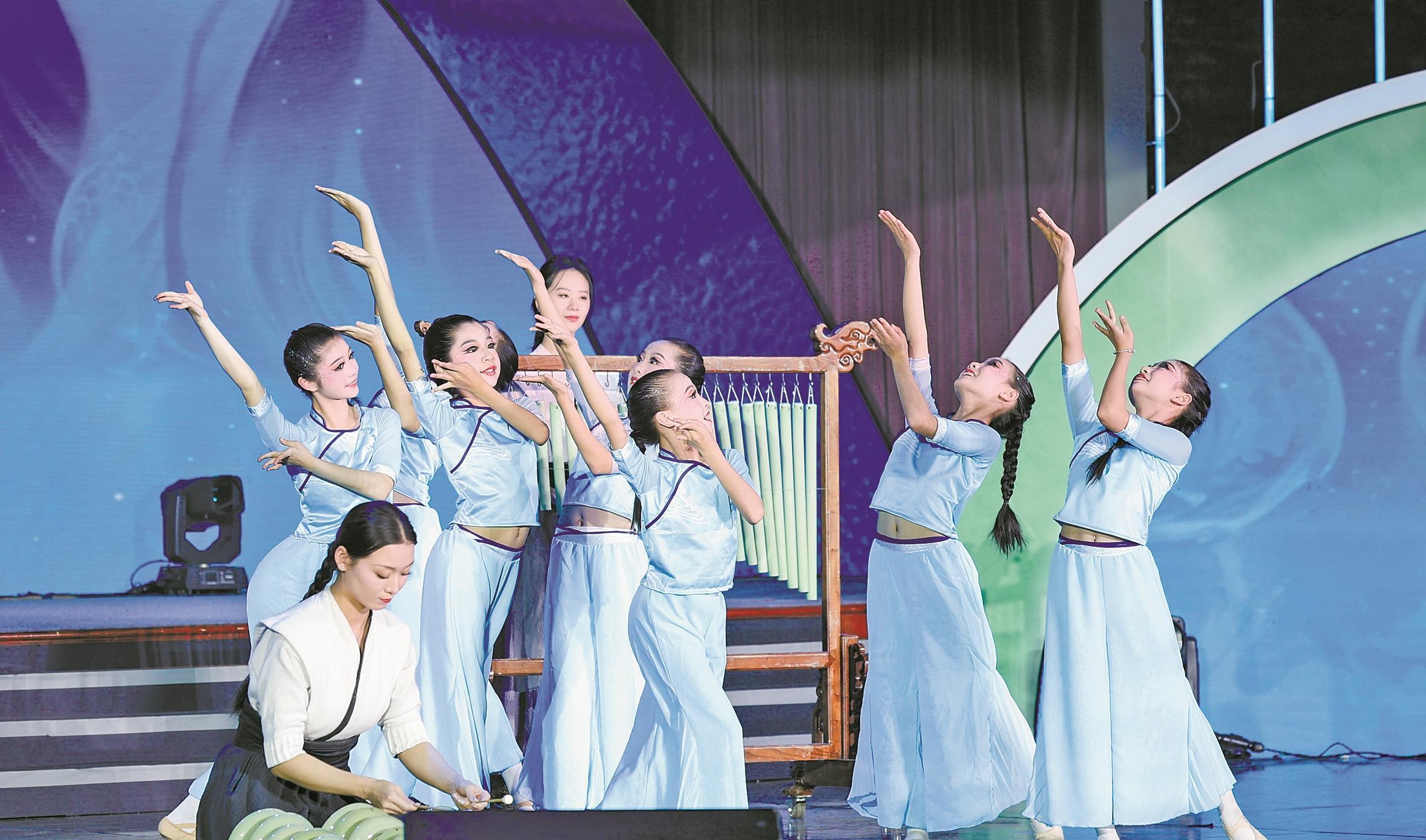 情景舞蹈《來來,村舞跳起來》中,來自海曙區(qū)龍觀鄉(xiāng)和石碶街道的廣場舞愛好者與街舞青年跨代合作,男女老少齊上陣?!拔覀儾环?、不服輸?!?6歲的陳英琴說,空閑時她就喜歡和村民一起跳廣場舞,演出已經(jīng)是“家常菜”;