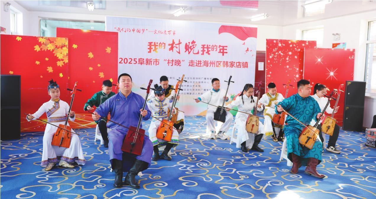 在阜新海州區(qū)高家店鎮(zhèn)“村晚”上,馬頭琴齊奏《白馬》(受訪者供圖)