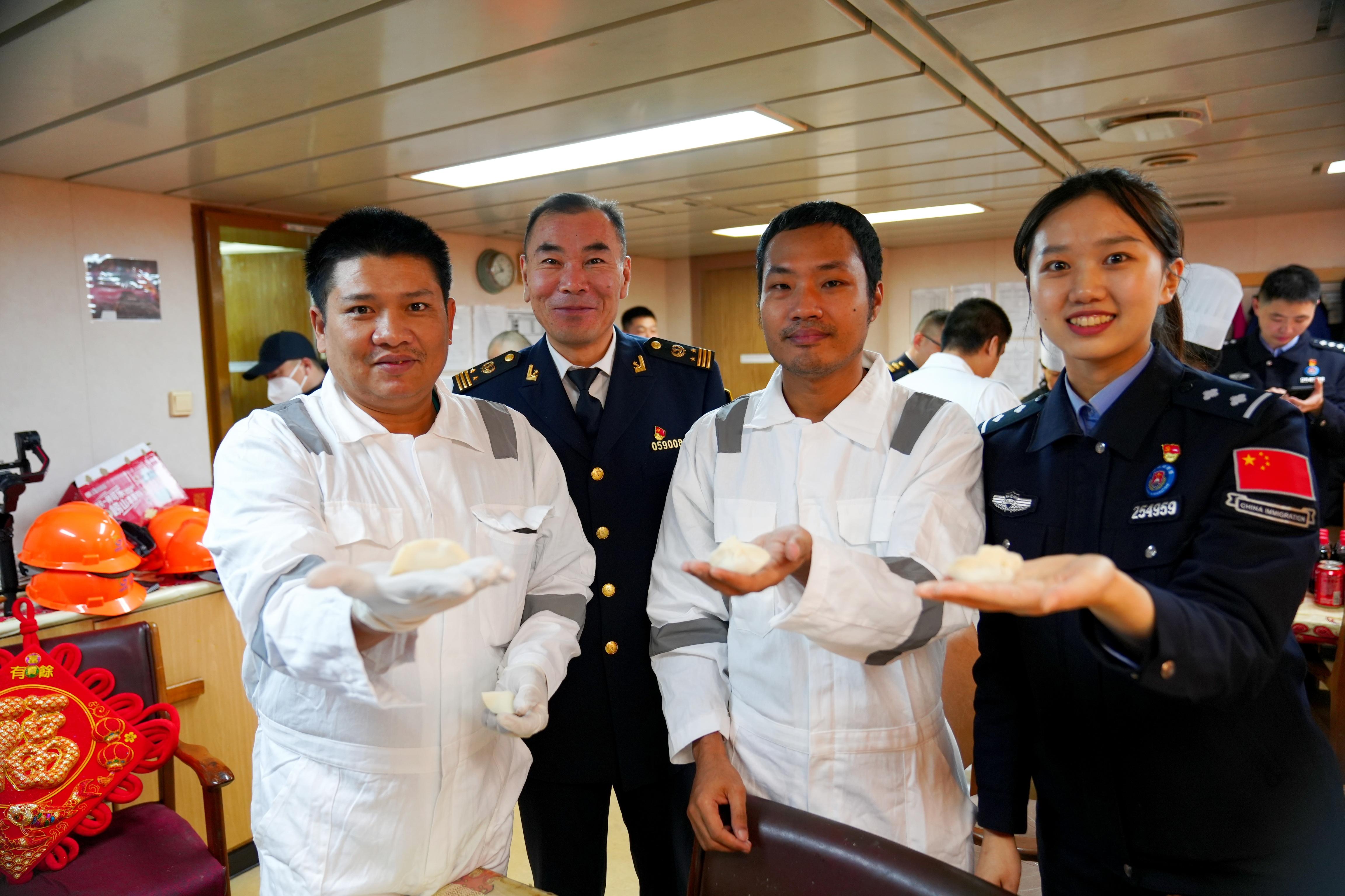 “餃子來(lái)啦!”11時(shí)30分,熱氣騰騰的餃子出鍋,中外籍船員們?cè)谝黄鹌炔患按仄穱L起來(lái)?!昂L臁陛嗇啓C(jī)長(zhǎng)豪長(zhǎng)建介紹,他在船上工作了8個(gè)多月,該輪已經(jīng)有兩個(gè)多月沒(méi)補(bǔ)充伙食了。他說(shuō),自抵達(dá)港口以來(lái),船員們都在各自的崗位上忙碌。小年這天,雖然船員們非常想吃上一頓餃子,可廚房里沒(méi)有可供制作的食材?!霸鞠牒?jiǎn)簡(jiǎn)單單湊合一頓,沒(méi)想到這么多部門(mén)組團(tuán)來(lái)給我們包餃子,心里特別溫暖。”他說(shuō)。
