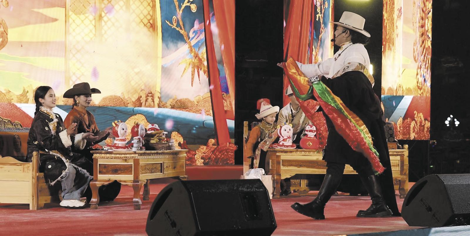 “今天是個吉祥的日子,我們歡聚一堂,舉起吉祥的美酒……”藏語歌曲《吉祥的日子》拉開了“村晚”的序幕。悠揚的骨笛、蕩氣回腸的扎木聶交織著歡快的鼓點響徹舞臺,藏族小伙兒、姑娘們表演的舞蹈《頌祥和》,一上場便掀起高潮,引得掌聲、喝彩聲不斷。