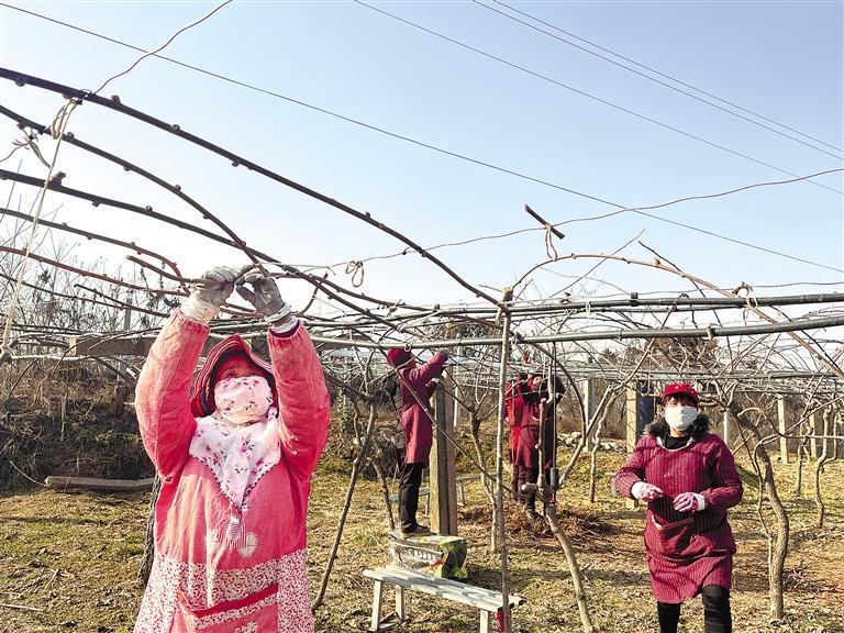 2月21日,杜列讓(左一)在給獼猴桃綁枝。記者 張佳儀 攝