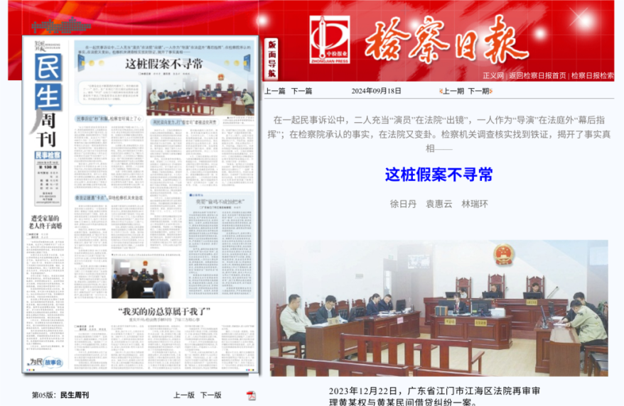 《檢察日?qǐng)?bào)》民生周刊首版刊登報(bào)道“黃某某與黃某民間借貸糾紛虛假訴訟案”