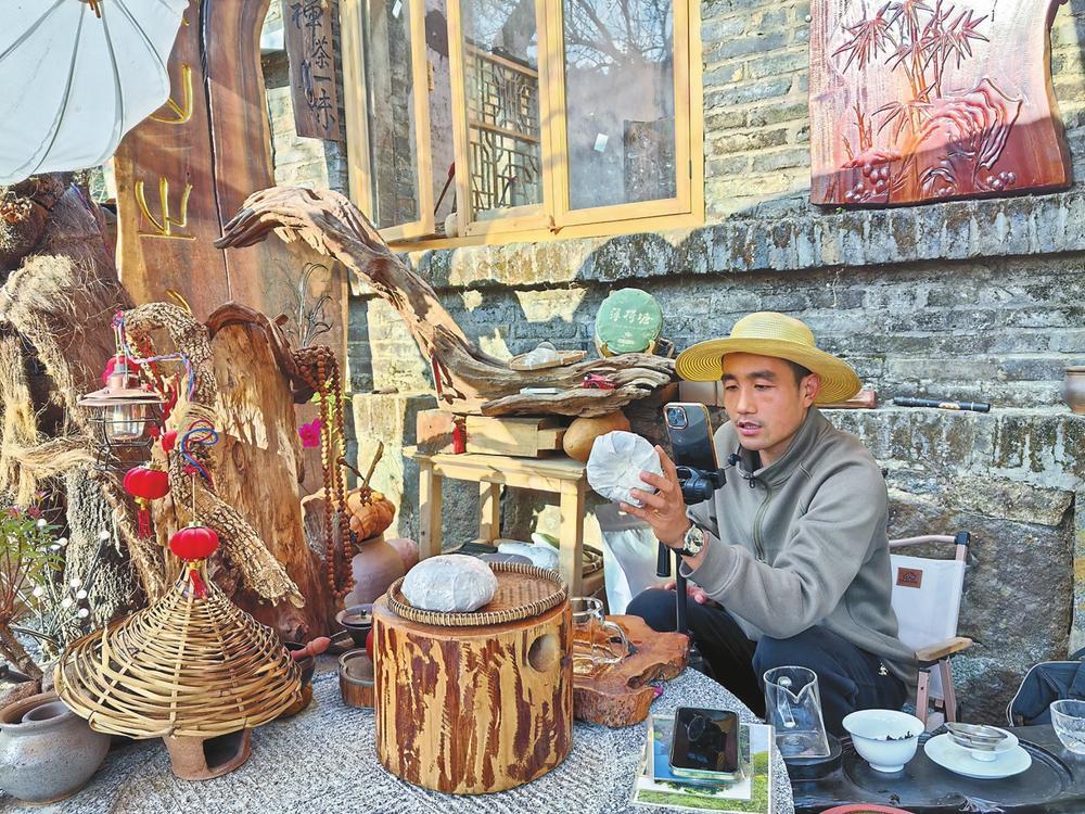 大乖來自陜西西安,是旅游愛好者。2022年,他通過網(wǎng)友介紹來到白云村,被這里“遠(yuǎn)上寒山石徑斜,白云生處有人家”的詩意景致吸引,便決定旅居于此?!斑@里不僅風(fēng)景如畫,還有茶葉、核桃、蜂蜜等土特產(chǎn)。我是主播,既然住下來,就想幫村民通過直播增收?!贝蠊缘南敕ǖ玫酱濉皟晌钡闹С?。他與團隊一起修繕村內(nèi)的“禪茶小院”,用于短視頻拍攝,又把老電站舊址改造成簡易直播間,讓古樸的村莊刮起一場“電商風(fēng)暴”。