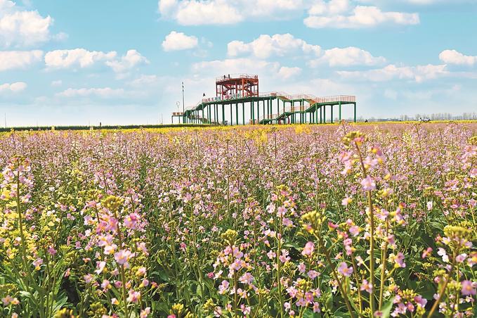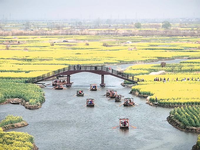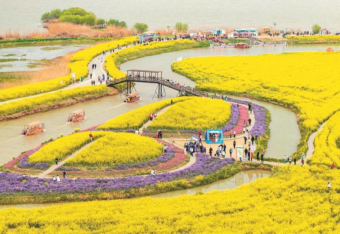 在蘇中,興化、高郵、如皋三市都不約而同“偏愛”油菜花。在興化千垛景區(qū),萬畝垛田花海演繹“河有萬灣多碧水,田無一垛不黃花”;在高郵湖上花海,“半城花海半城詩”的獨特景觀,吸引了眾多游客;在如皋平園池村,五彩油菜花好似打翻春日“調(diào)色盤”……