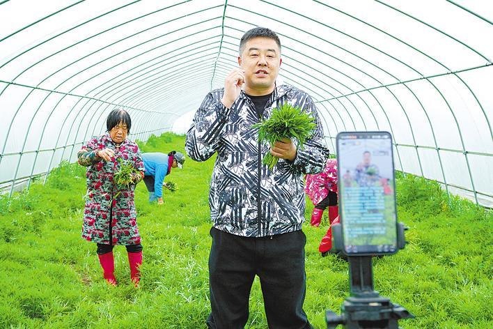 3月28日上午,應南村村支書劉勇正在蔬菜大棚中為新鮮藜蒿直播帶貨。(洪湖市委宣傳部供圖)