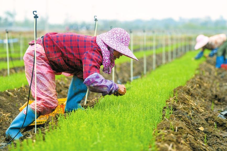 4月5日,美蘭區(qū)演豐鎮(zhèn)塔市村的鹽堿地里綠意盎然,農(nóng)戶正忙碌地將嫩綠的海蟲草苗移栽到大田。這片曾因海水侵蝕被破壞過的土地,如今借科技之力“種綠生金”,成了漁民“向岸上走”轉(zhuǎn)產(chǎn)轉(zhuǎn)業(yè)的“致富田”。