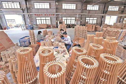 在融安縣融嘉工藝有限公司生產(chǎn)車(chē)間,工人正在生產(chǎn)竹制燈罩。記者 彭華 通訊員 譚凱興 攝