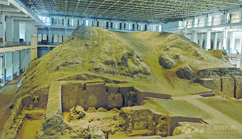 吉木薩爾縣北庭高昌回鶻佛寺遺址博物館內(nèi)展示的部分西寺遺址。