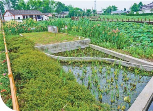 荷塘邊,水聲汩汩。草地下,是由3座池子組成的微動力污水處理池?!斑@里包括沉渣池、四級厭氧池和濕地池。”王敏說,農(nóng)戶家中排出的污水經(jīng)過沉淀和厭氧處理,再經(jīng)過濕地池火山石凈化,達標后排入荷塘。