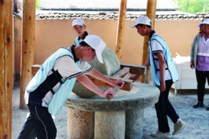 神玉村的名氣越來越響,許多研學(xué)團(tuán)也紛至沓來。記者到訪時(shí),180多名黃龍縣初級中學(xué)初二的學(xué)生正在神玉村開展研學(xué)活動,他們動手磨豆?jié){、包餛飩、生火做飯,感悟“一粥一飯,當(dāng)思來之不易”的道理。