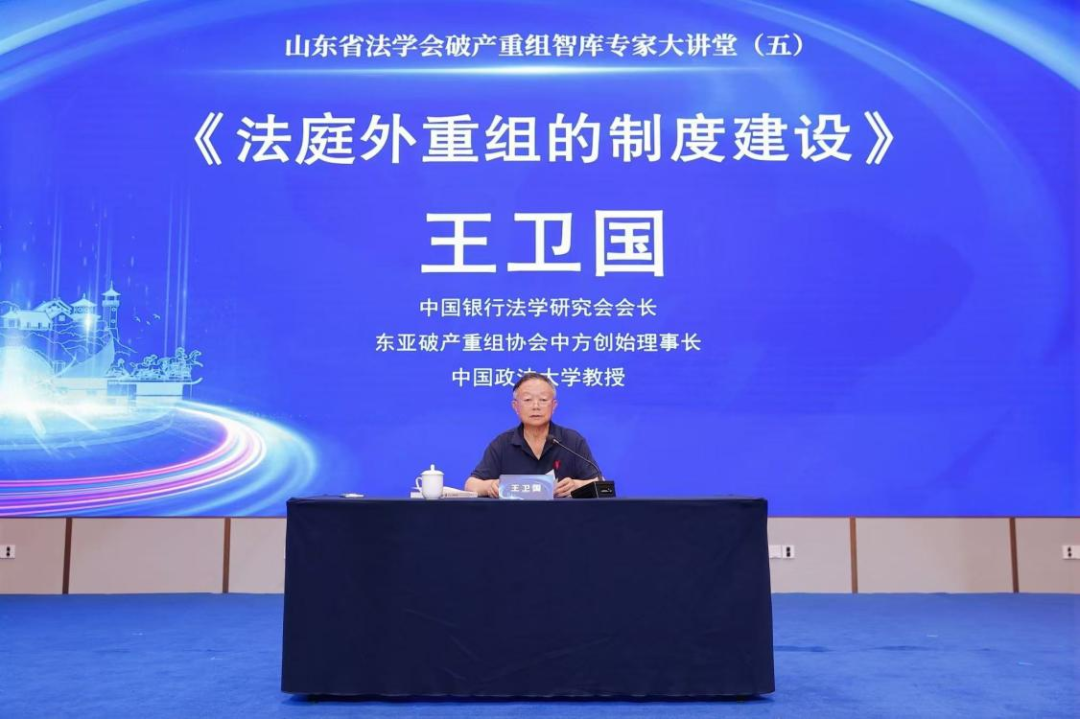 山東省法學會破產重組智庫專家、中國銀行法學研究會會長、東亞破產重組協(xié)會中方創(chuàng)始理事長、中國政法大學教授王衛(wèi)國作《法庭外重組的制度建設》的主旨發(fā)言,系統(tǒng)地從庭外重組的性質、地位、意義、模式以及庭外重組與司法制度的銜接問題等方面講述了庭外重組制度的構建路徑,強調必須將治理金融風險和企業(yè)的債務困境放在一個非常突出的地位,指出庭外重組的三種模式及制度建設的目標和要素,通過對國內外破產制度的實踐進行對比、分析,為危困企業(yè)市場化、法治化拯救提供更堅實的規(guī)則支撐,助力優(yōu)化營商環(huán)境與經濟高質量發(fā)展。他通過系統(tǒng)闡釋了法庭外重組制度建設的核心理念與實踐路徑,對庭外重組制度的研究思路進行了深入分析,為庭外重組制度的理論研究和實務問題解決提供啟發(fā)與新的思路。