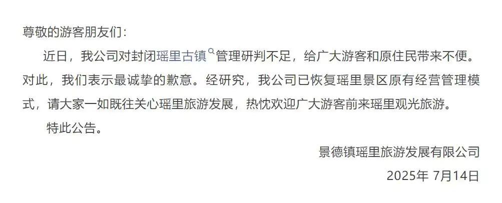 在村民的反對和輿論關(guān)注下,7月14日,江西省景德鎮(zhèn)市瑤里景區(qū)發(fā)布公告稱,近日,我公司對封閉瑤里古鎮(zhèn)管理研判不足,給廣大游客和原住民帶來不便。對此,我們表示最誠摯的歉意。經(jīng)研究,我公司已恢復瑤里景區(qū)原有經(jīng)營管理模式,請大家一如既往關(guān)心瑤里旅游發(fā)展,熱忱歡迎廣大游客前來瑤里觀光旅游。