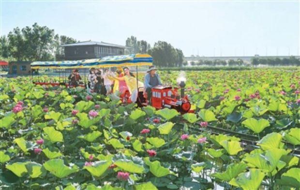 游客在河南焦作黃河龍澤園乘游覽小火車賞荷。劉金元 攝