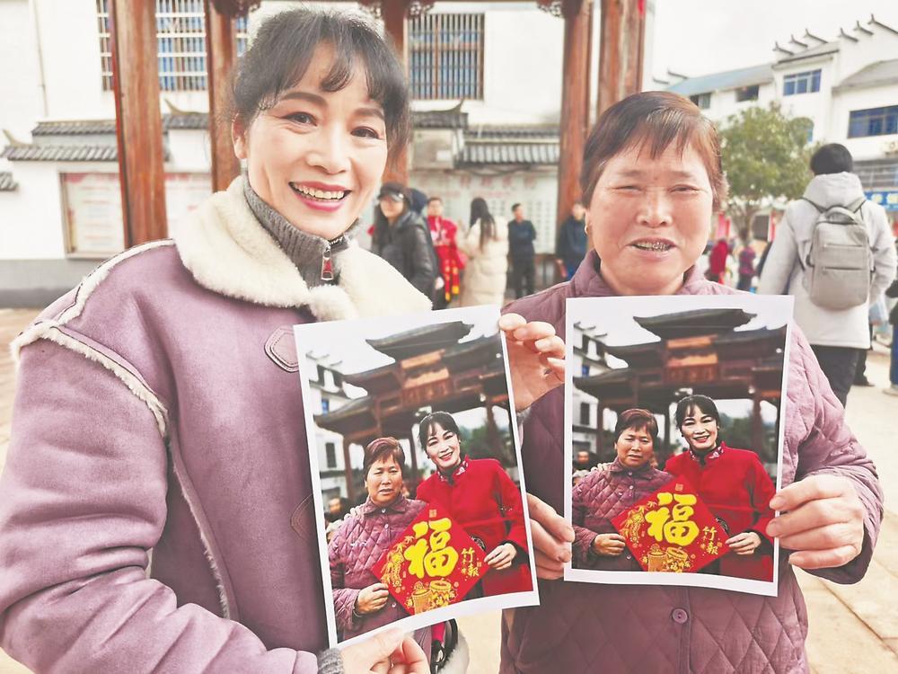 在泰寧縣下渠鎮(zhèn)文化廣場,文藝志愿者為村民拍攝全家福。
