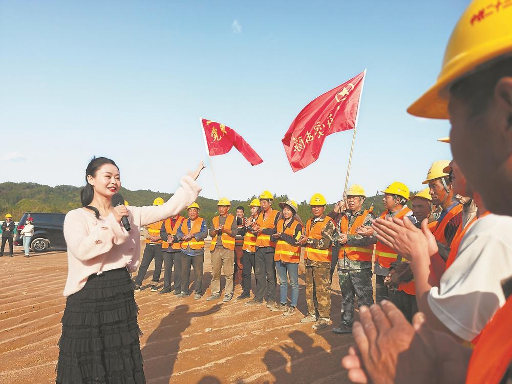 在明溪縣胡坊互通建設(shè)工地上,“遠(yuǎn)山三人行”文藝志愿服務(wù)隊(duì)把歡歌笑語帶到筑路工人身旁。