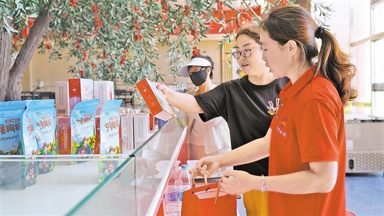 大學(xué)生李文迪為游客推介枸杞產(chǎn)品。