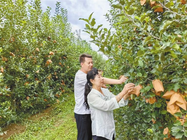 7月23日,韓英杰(左)在蘋果園里指導群眾管護果樹。記者 李靜茹 攝