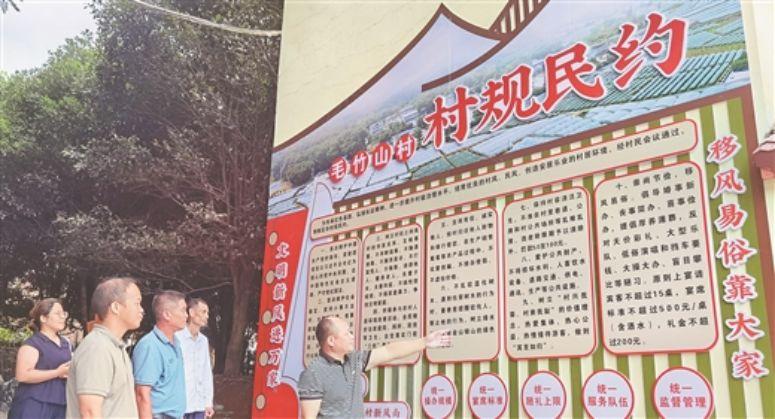 盛夏時節(jié),在廣西壯族自治區(qū)桂林市全州縣才灣鎮(zhèn)南一村委毛竹山村,村口宣傳欄上嶄新的《村規(guī)民約》格外醒目。曾讓村民愁眉不展的“仔仔債”(當(dāng)?shù)嘏f俗,老人去世時,外嫁女需置辦大量煙酒紅包、點心等“仔仔”,分發(fā)給吊唁親友)已成為歷史。