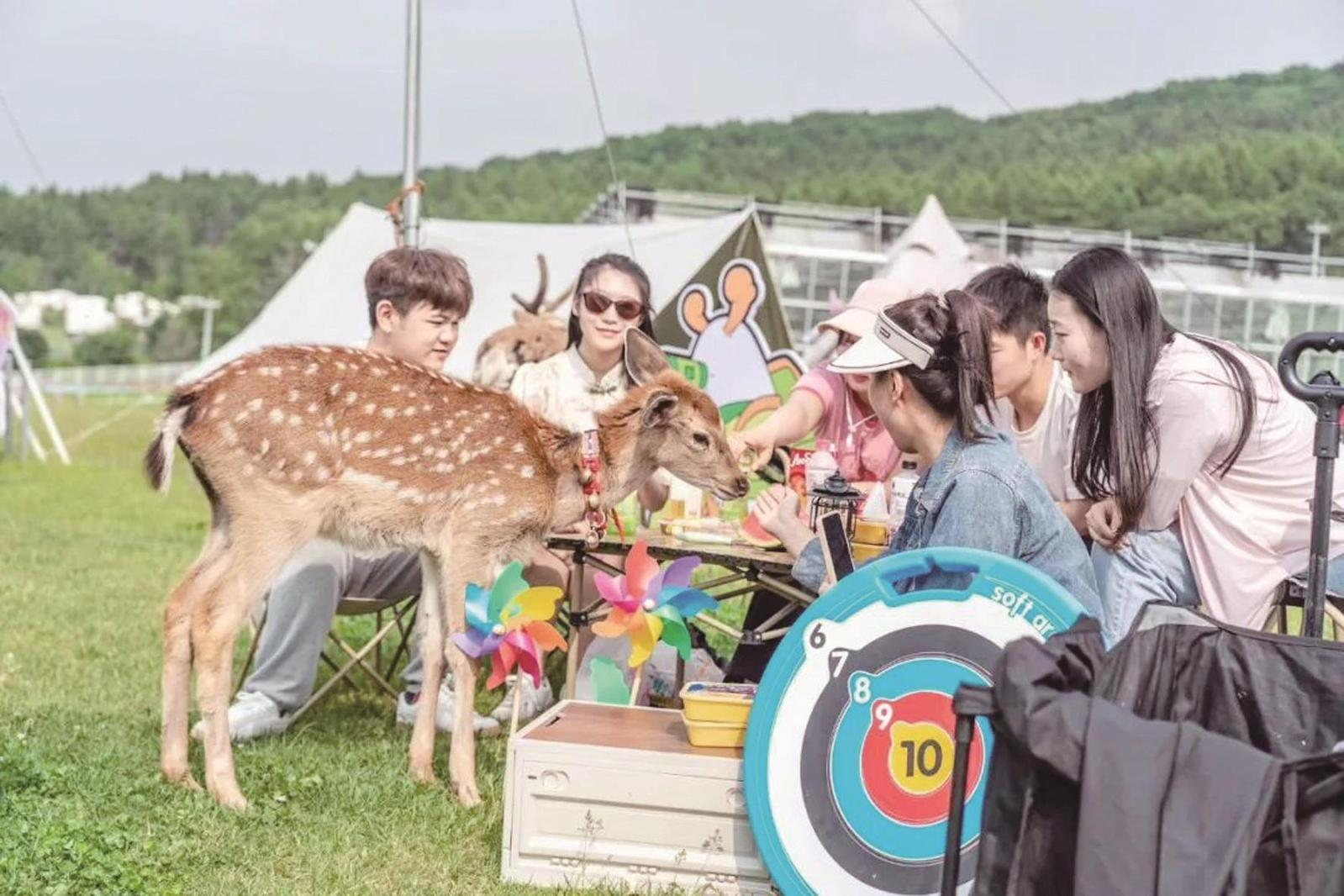 在長春市雙陽區(qū)神鹿峰景區(qū),游人與景區(qū)梅花鹿互動。